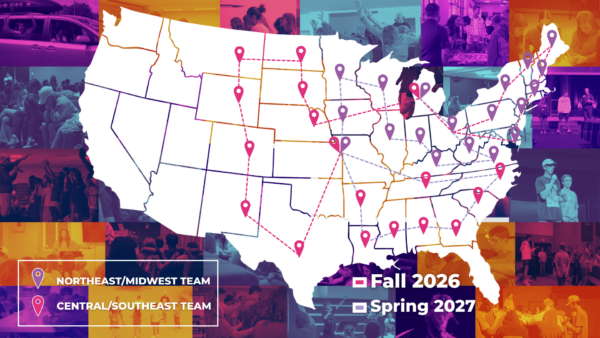 Two teams of four young adults will commit the 2026-2027 school year to devote their time and talents to call a generation to pray for change across America. In 10,000 miles, this team will interact with students, pastors, leaders, families, and churches to build meaningful relationships and mobilize young people to intercede for campuses in the western region of the United States.