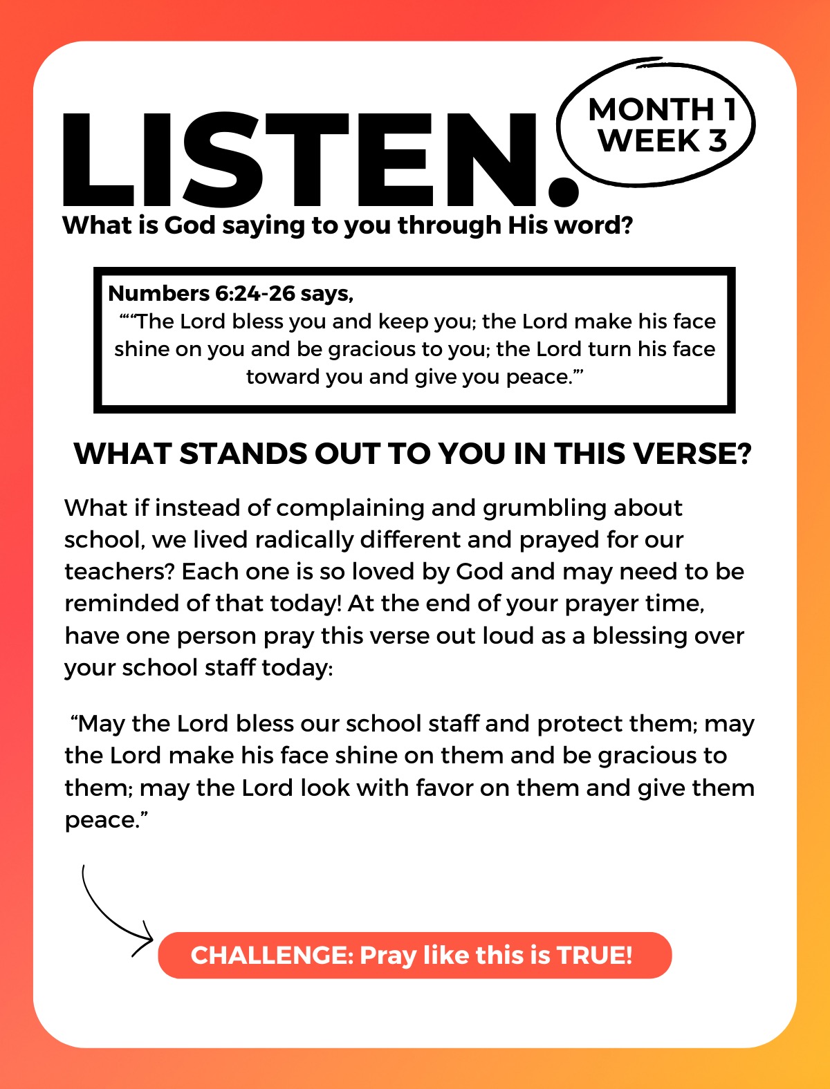The CYC Prayer Guide has content for an entire semester of prayer meetings! It takes 10-15 minutes to meet and pray powerfully over the issues your school faces and for the friends who don’t yet know Jesus! Prayer will change your school because of who we’re praying to. Let’s get started!